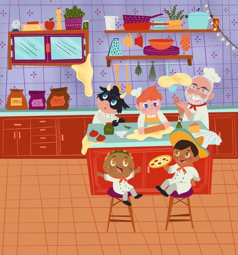 Illustrations for the children's kitchen wall at El Punto Múltiple, featuring the restaurant's characters having fun cooking.